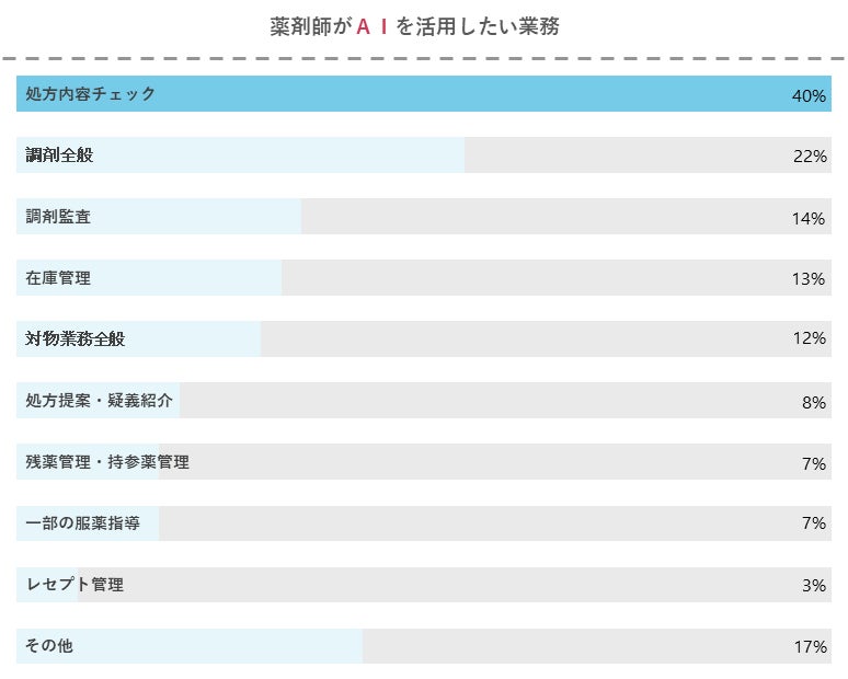 - 薬剤師がAIを活用したい業務の最多は、「処方内容のチェック」が81%