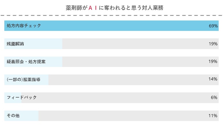 - 薬剤師がAIに奪われると思う対人業務の最多は、「処方内容のチェック」が69%