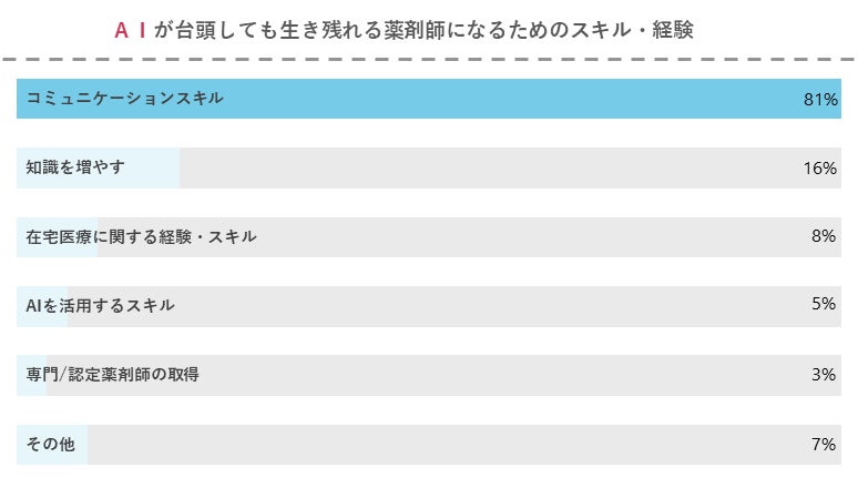 - AIが台頭しても生き残れる薬剤師になるためのスキル・経験の最多は、「コミュニケーションスキル」が81%
