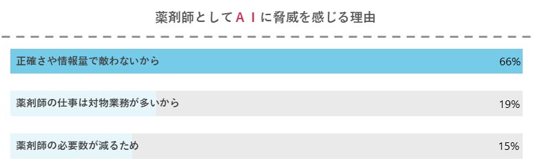 - 薬剤師がAIに脅威を感じる理由の最多は、「正確さや情報量で敵わないから」で66%