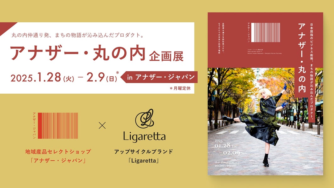大丸有エリアマネジメント協会(東京都千代田区丸の内)は、アップサイクルブランド「Ligaretta(リガレッタ)」×地域産品セレクトショップ「アナザー・ジャパン」のコラボレーション企画展『アナザー・丸の内』を、 2025年1月28日(火)から2月9日(日)まで、大手町の「アナザー・ジャパン」で開催します。