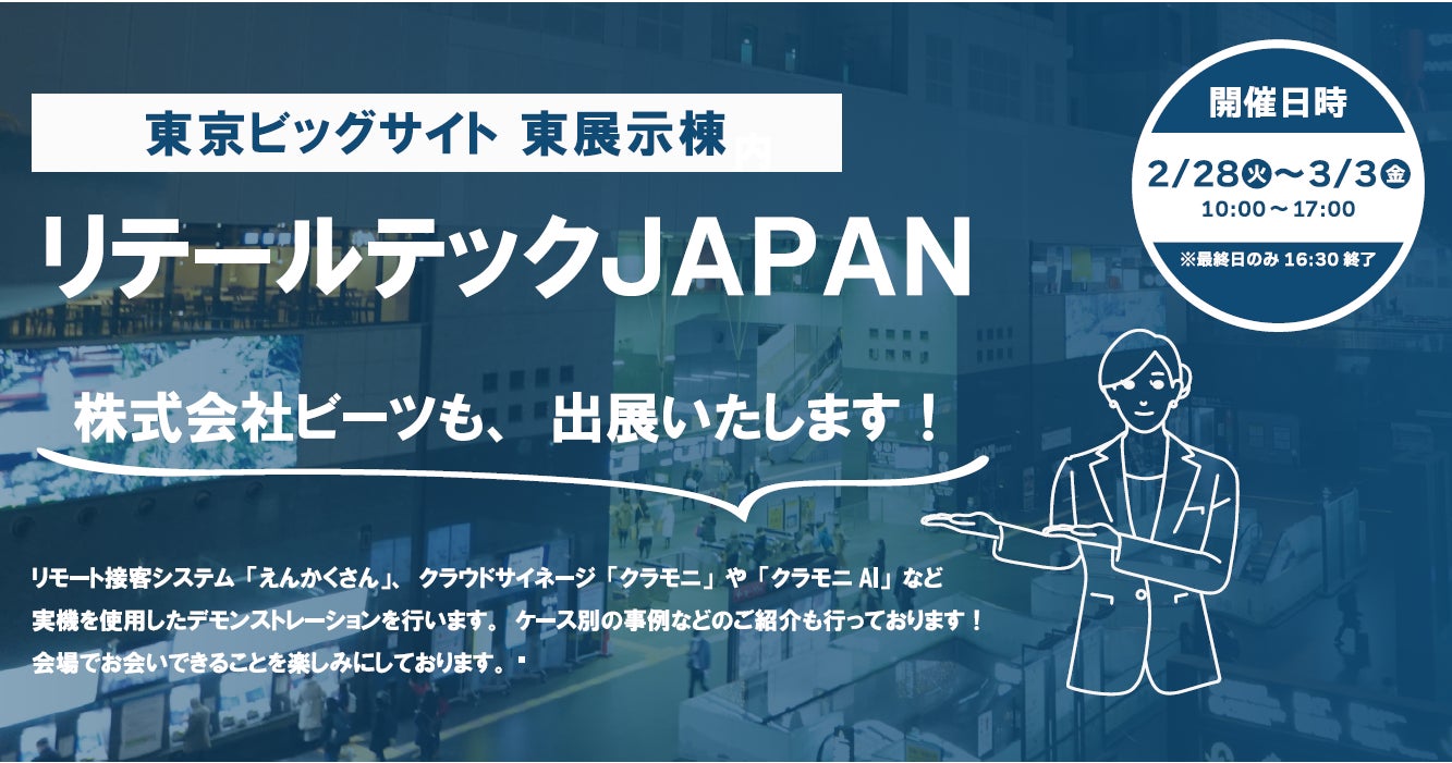 店頭DX、接客DXを中心とするトータルマーケティングエージェンシーの株式会社ビーツ(代表取締役社長:上野山沢也、大阪府大阪市北区、以下「ビーツ」)は、『リテールテックJAPAN』(会期 2023年2月28日(火)~3月3日(金))に出展いたします。リモート接客システム「えんかくさん」、クラウドサイネージ「クラモニ」をはじめとするリアル店舗のCX向上や省人化を実現するデジタルソリューションをご紹介します。