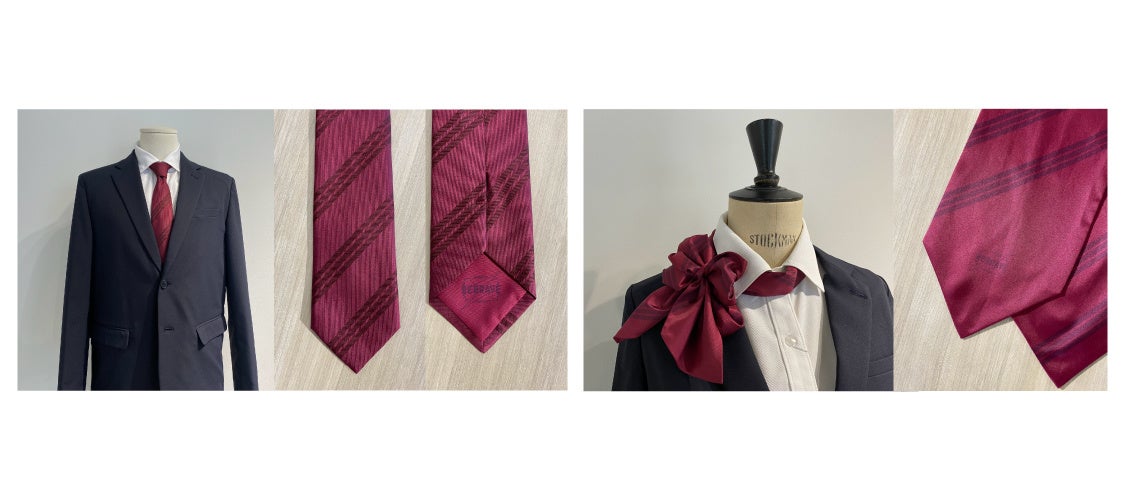 素材は、「ネクタイ」ヨコ糸:再生ポリエステル100% 経糸:ポリエステル100%、「スカーフ」再生ポリエステル100%になっており、こちらも環境に配慮した素材になっています。