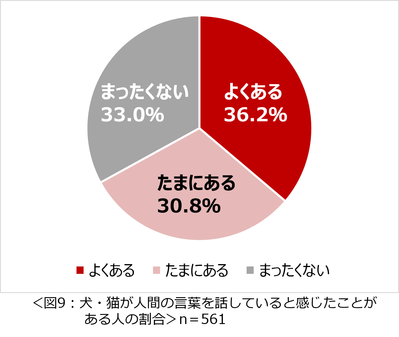 「犬や猫が人間の言葉や想いを理解していると思うことはありますか」と質問したところ、「よくある」が62.7%、「たまにある」が34.6%で、約97%の人が犬・猫が人間の言葉や想いを理解していると感じていることがわかりました。(図8)