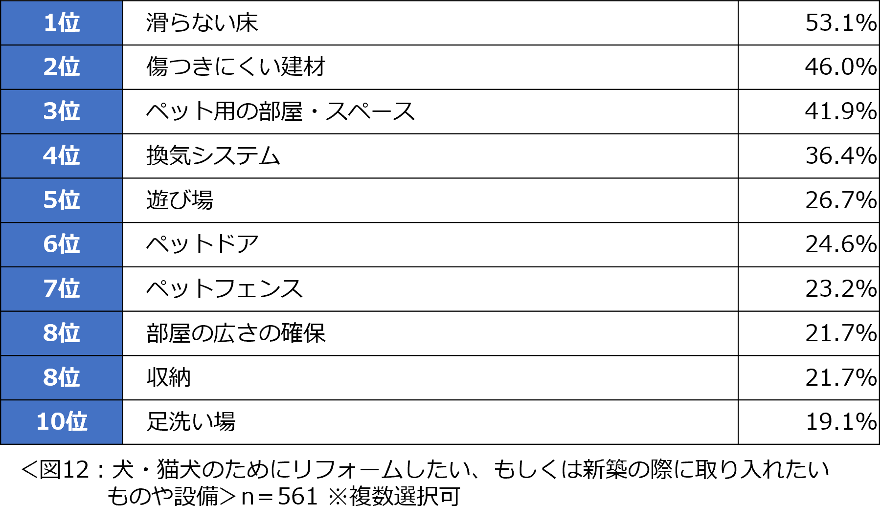 「犬や猫のためにリフォームしたい、もしくは新築の際に取り入れたいものや設備はありますか」と尋ねたところ、1位は「滑らない床」でした。続いて「傷つきにくい建材」、「ペット用の部屋・スペース」、さらには「換気システム」が上位となりました。(図12)