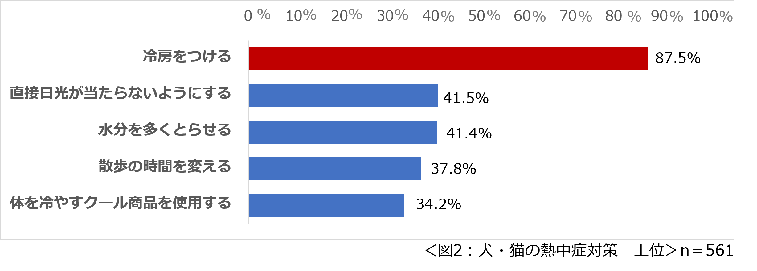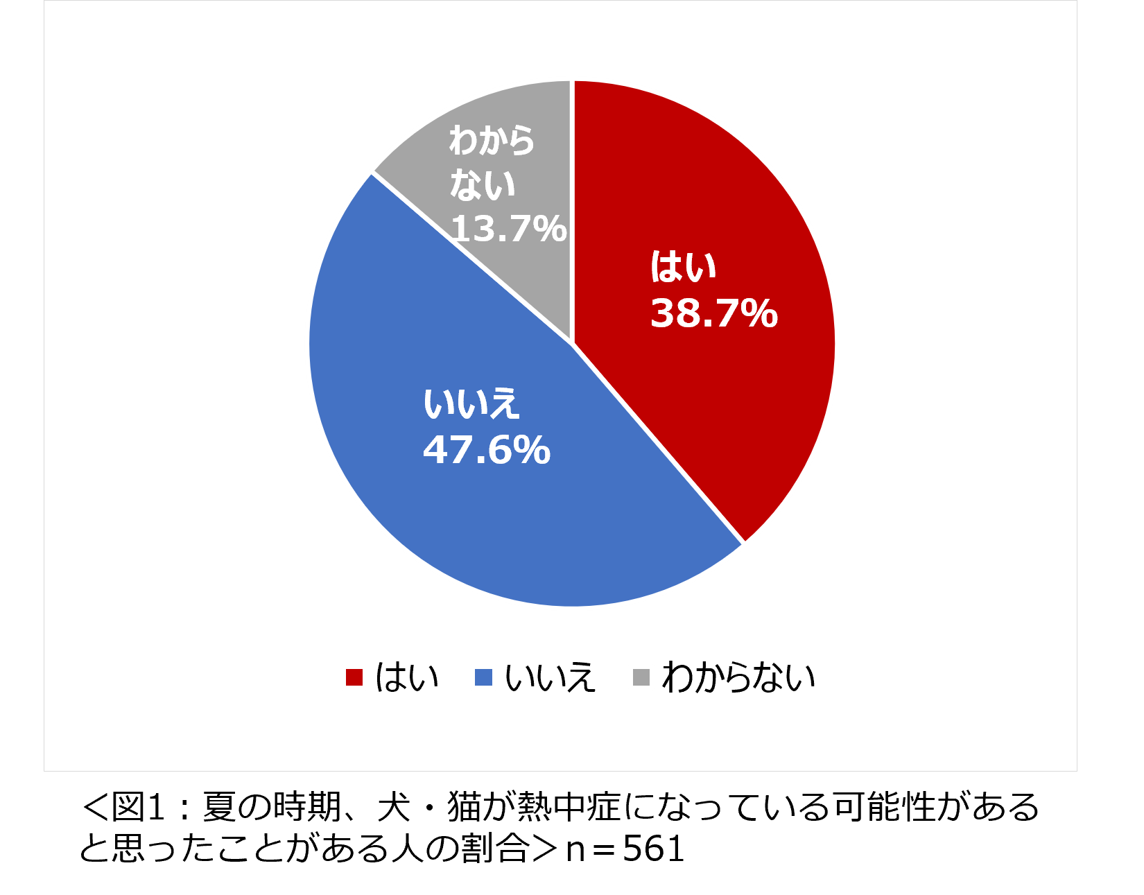 犬・猫を飼っている561名に「夏の時期、犬や猫が熱中症になっている可能性があると思ったことがありますか」と尋ねたところ、約4割の人が「はい」と回答しました。(図1)