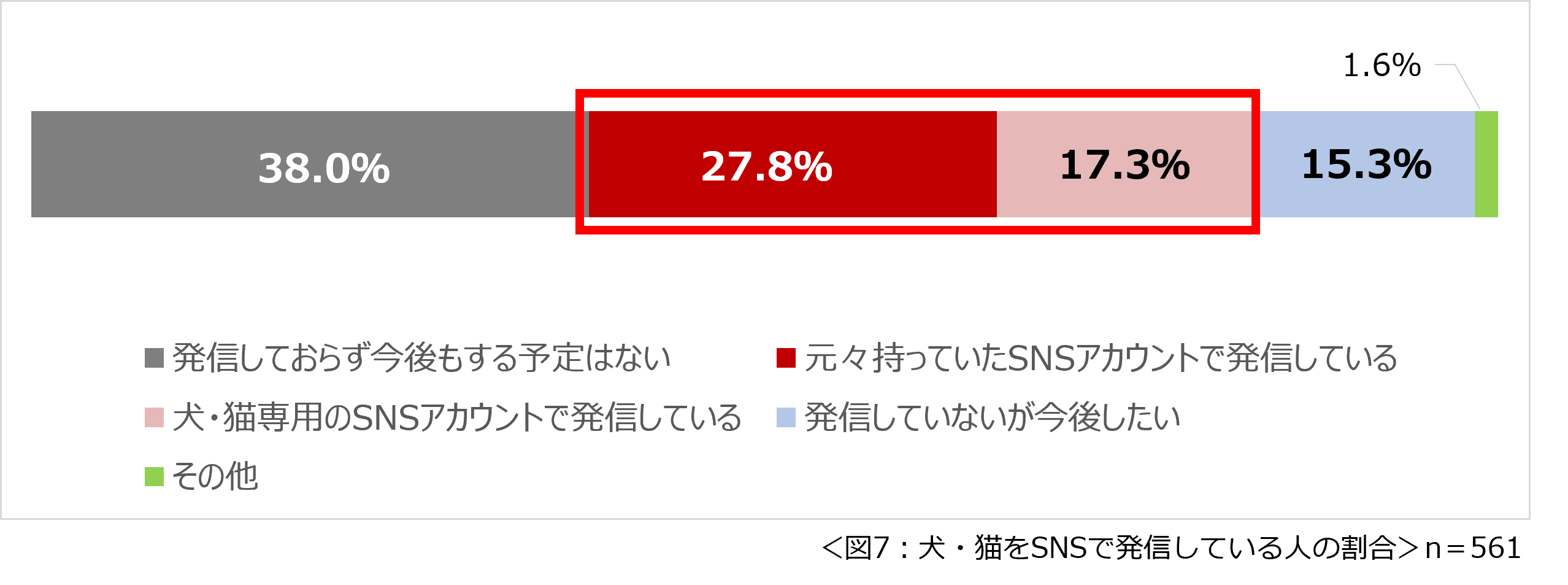 「SNSで犬や猫のことを発信していますか」と尋ねたところ、約半数がSNSで犬・猫のことを発信し、そのうちの約4割は、専用のSNSアカウントを持っていることもわかりました。(図7)