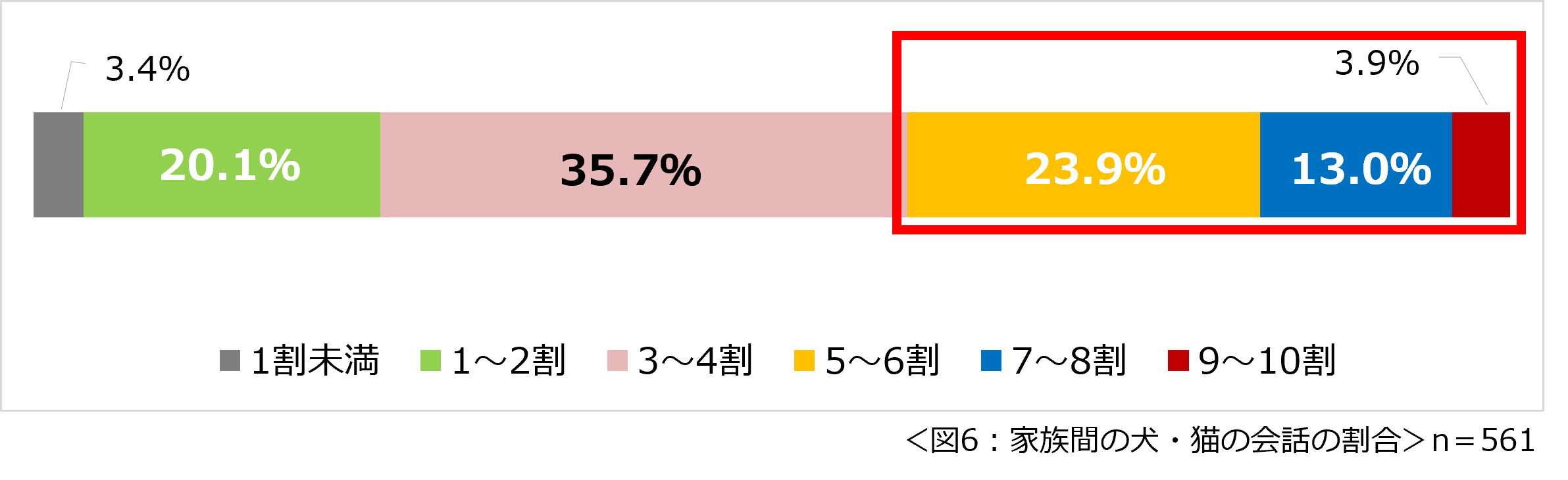 家族間での会話のうち、犬・猫に関する話題の割合は3~4割が最多。