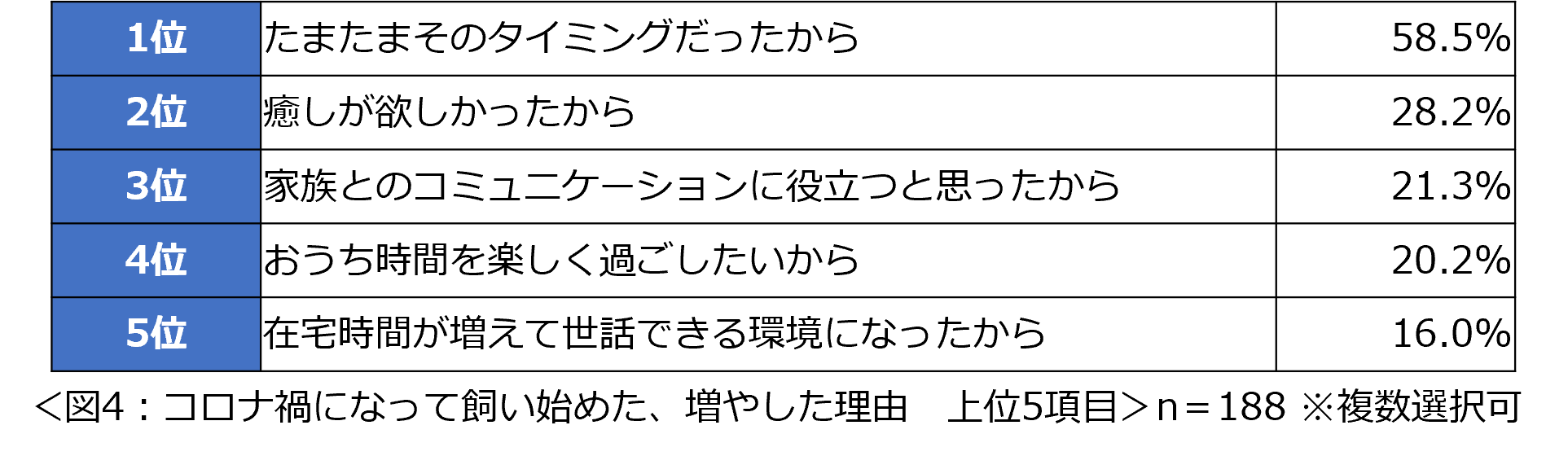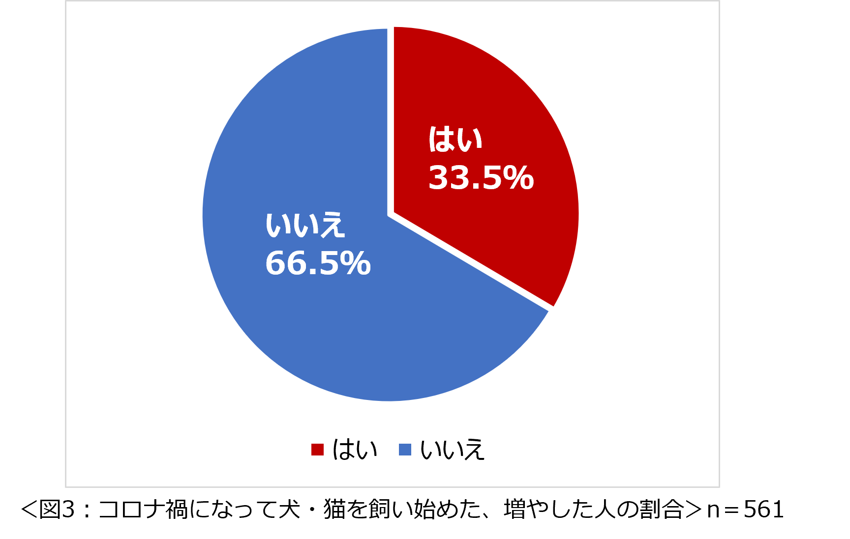 「コロナ禍になってから犬または猫を飼い始めましたか。または増やしましたか」という問いに対して、「はい」と回答した方は約3割でした。(図3)