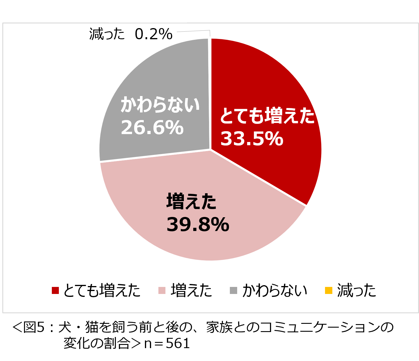 「犬や猫を飼う前と後で、家族とのコミュニケーションは増えましたか」という問いには、「増えた」と回答した人が最も多く、「とても増えた」と回答した33.5%と合わせると、7割以上の人が家族のコミュニケーションが増えたことがわかりました。(図5)