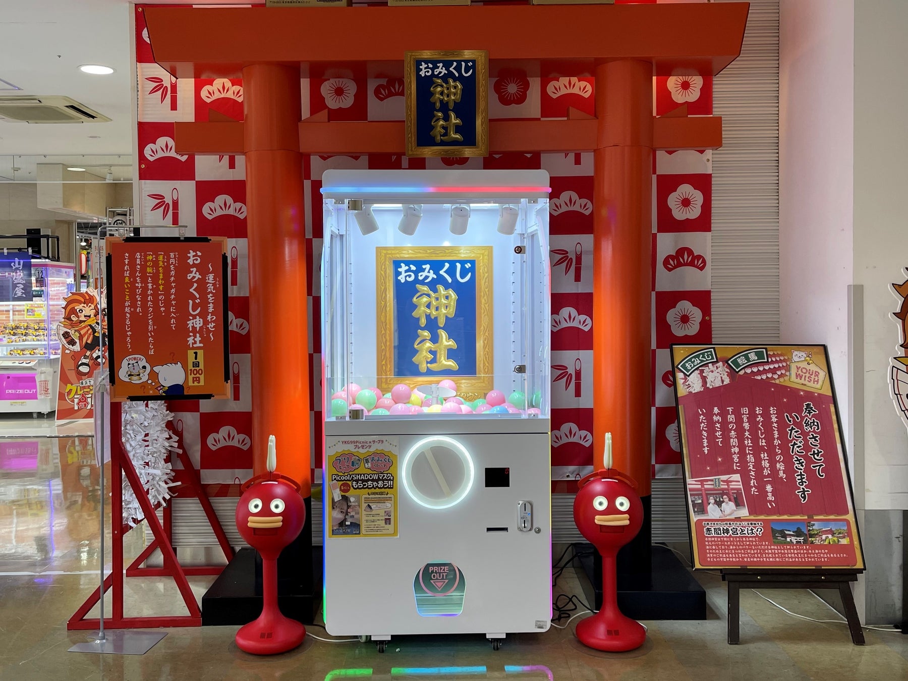 入口を入るとそこはお祭りの世界感。祭りばやしが流れる「縁日参道」の先には、狛犬ならぬ「拍手ロボット」を従えた『おみくじ神社』がお客様をお出迎えします!(※写真はサープラ横浜あそびタウン)