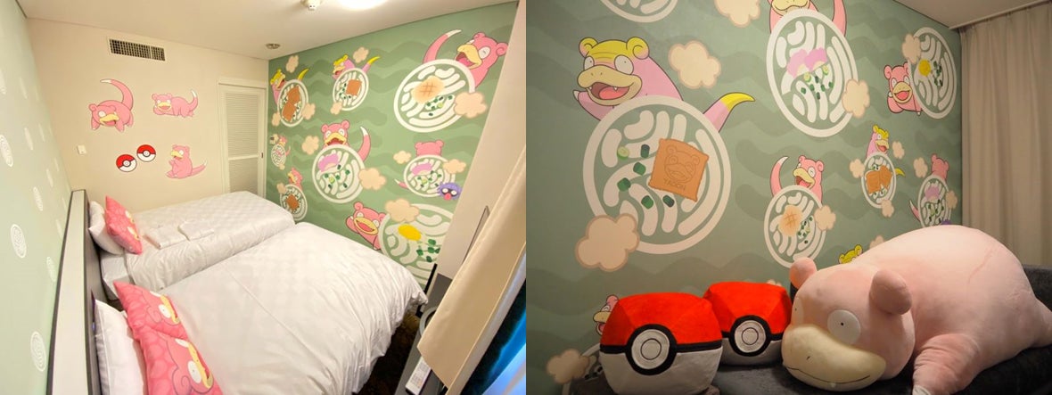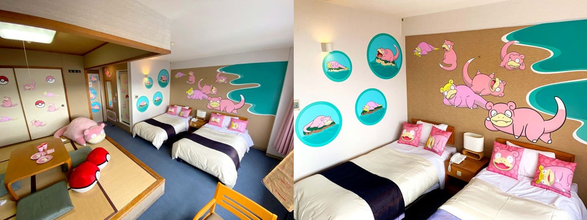 ヤドンとの時間をじっくり過ごしたい。寝ている間もヤドンと一緒にいたい。そんなディープなヤドンファンにおすすめなのが「ヤドンのお宿」です。ヤドンの壁、ヤドンの窓、ヤドンのグッズ、そして等身大のヤドン(ぬいぐるみ)。ヤドンだらけの部屋は、にぎやかで飽きさせないデザインです。宿泊された方には、特製のハンドタオルもプレゼント。