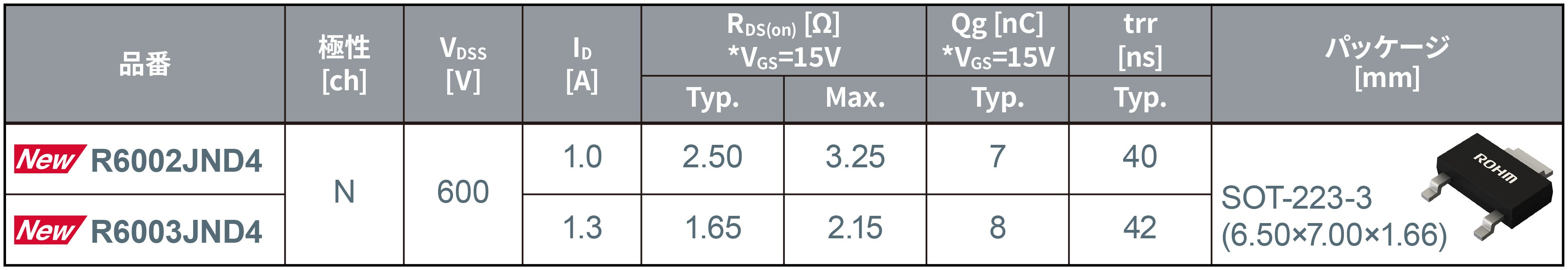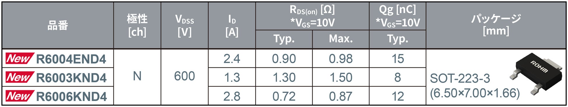 ローム株式会社(本社:京都市)は、照明の小型電源やポンプ、モーターなどに最適で、小型SOT-223-3パッケージ(6.50mm×7.00mm×1.66mm)の600V耐圧Super Junction MOSFET(*1)「R6004END4 / R6003KND4 / R6006KND4 / R6002JND4 / R6003JND4」の5機種を開発しました。