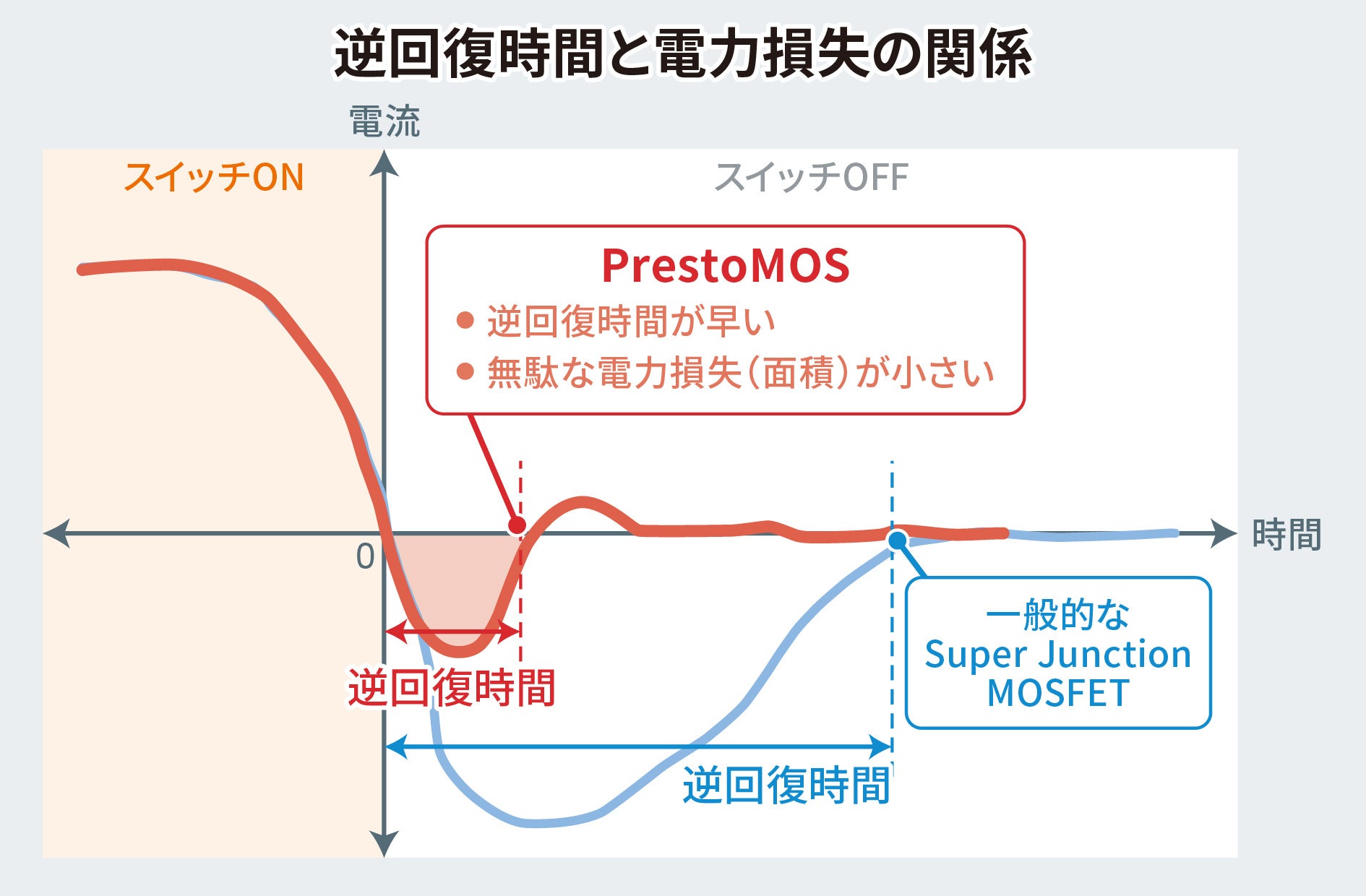 ロームのPrestoMOSは、Super Junction MOSFETの高耐圧かつ低オン抵抗という特長はそのままに、内蔵ダイオードの逆回復時間を高速化した、ロームオリジナルのパワーMOSFETです。スイッチング損失の低減が可能となるため、エアコンや冷蔵庫など、インバータ回路を搭載したアプリケーションでの採用が進んでいます。
