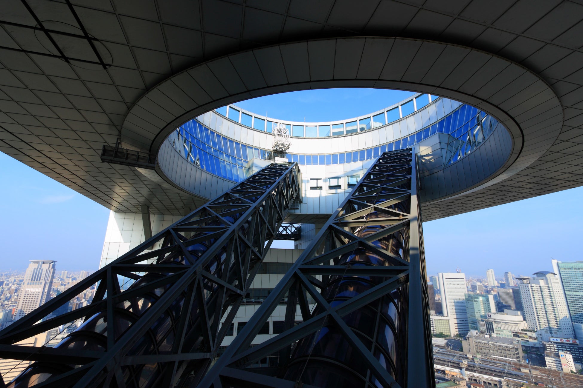 梅田スカイビルは、2つのビルが屋上を含む上層部「空中庭園」でつながる独特のフォルムの連結超高層ビル。