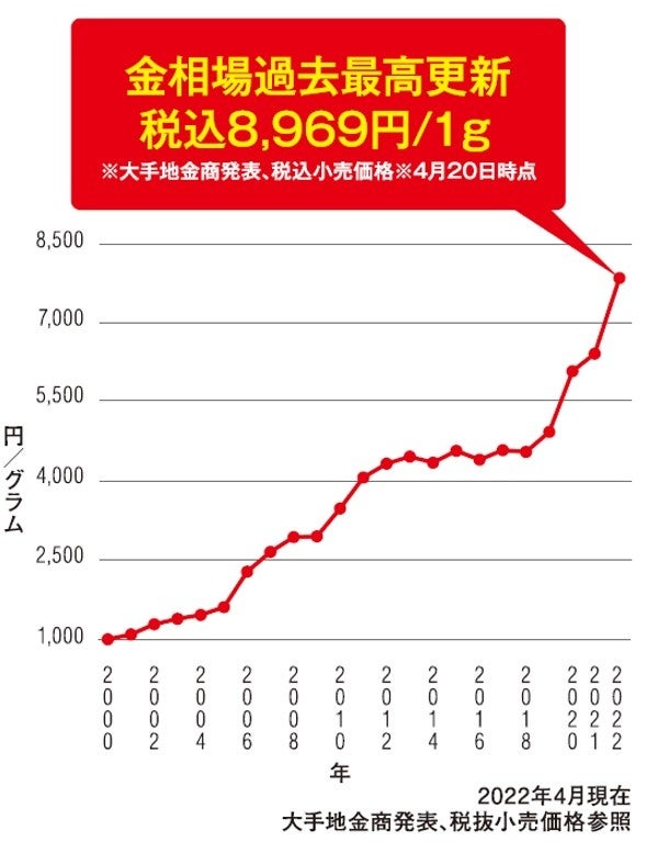 その中、世界情勢が大きく揺らぎはじめたことを受け、現物資産への期待がより一層高まったことにより、今年の4月には過去最高値8,969円(大手地金商発表税込小売価格)を記録しました。