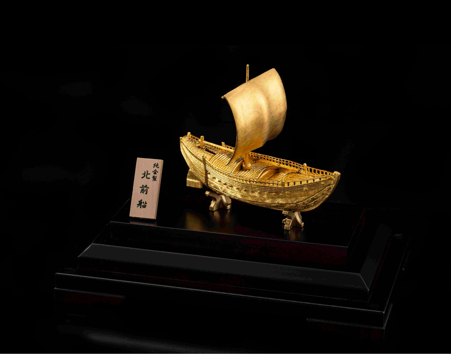 江戸時代中期から明治時代まで、中国~北海道を日本海回りで、商品を売り買いしながら結んでいた商船群。その時代の日本経済や文化の発展に大きく寄与したと言われています。「動く商社」とも称され、一攫千金を夢見た人々のロマンがつまった「北前船」を豪華な純金で再現しました。