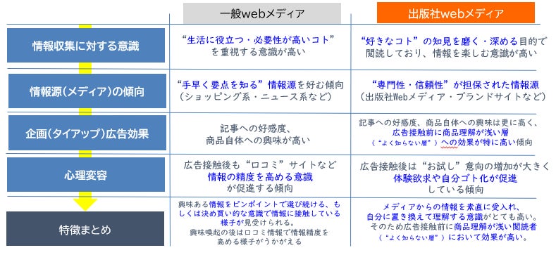 (cap)今回の調査結果サマリー。一般Webメディアと出版社Webメディアでは、同じWebメディアでも、そこには違いがあることがわかった