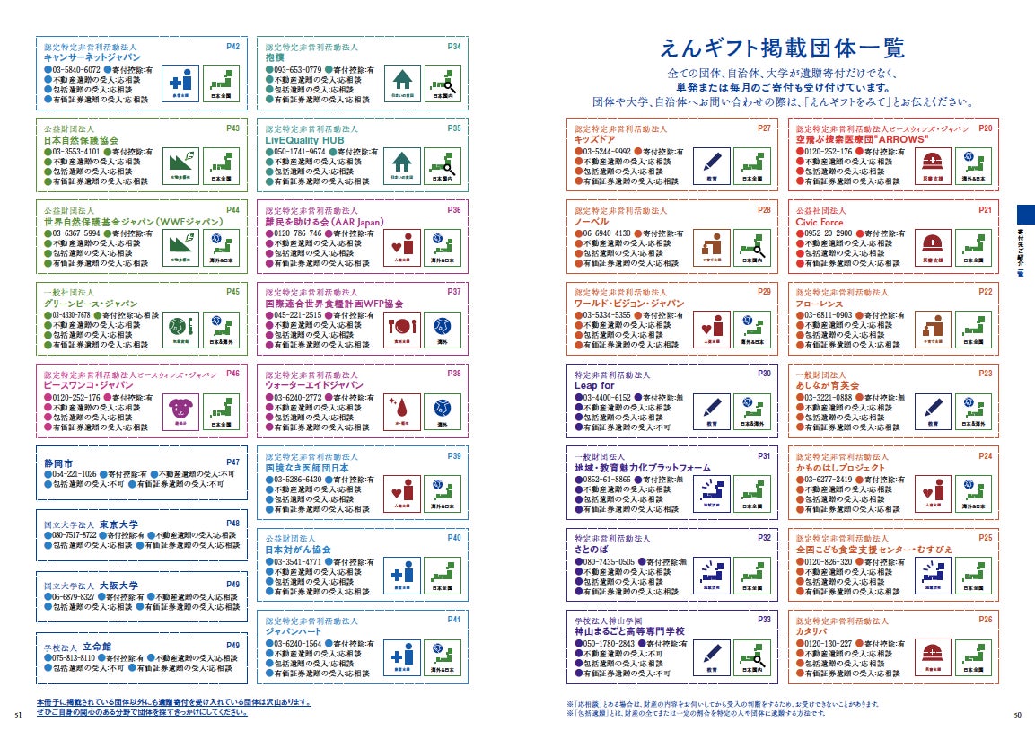 えんギフトは、当協会が年に一度発行する、遺贈寄付に特化した無料の情報冊子です。遺贈寄付を入り口に社会貢献への敷居を下げ、読者が「私にもできる社会貢献」を探せることを目的に発行しています。冊子では、遺贈寄付の特徴や寄付先の選び方、「遺贈寄付の受入」と「社会課題への取り組み」両軸の実績が豊富な団体、自治体、大学を掲載しています。