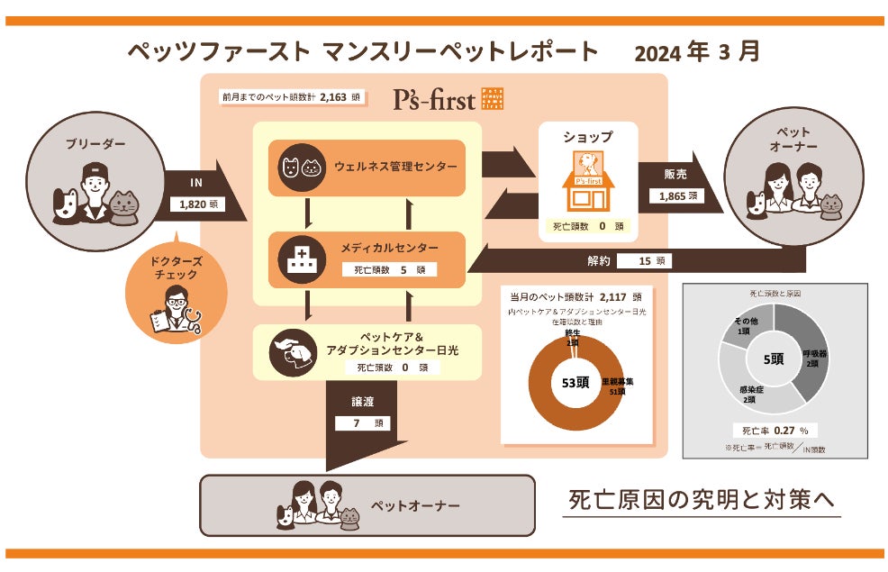 2024 年3月1日から3月31日までにペッツファーストグループが取り扱ったペット、すなわち契約ブリーダーから引き受けたペットの頭数が1,820頭、Pʼs-firstでのご契約数は 1,865頭、里親譲渡数が7頭、ご解約数が15頭です。