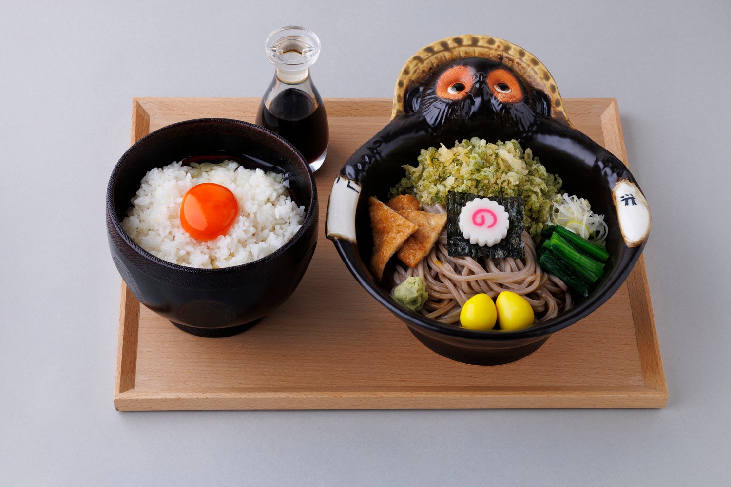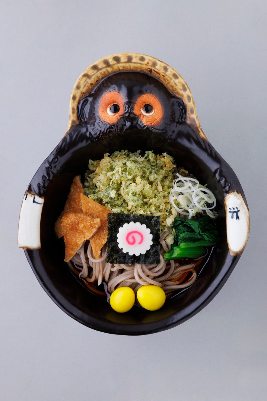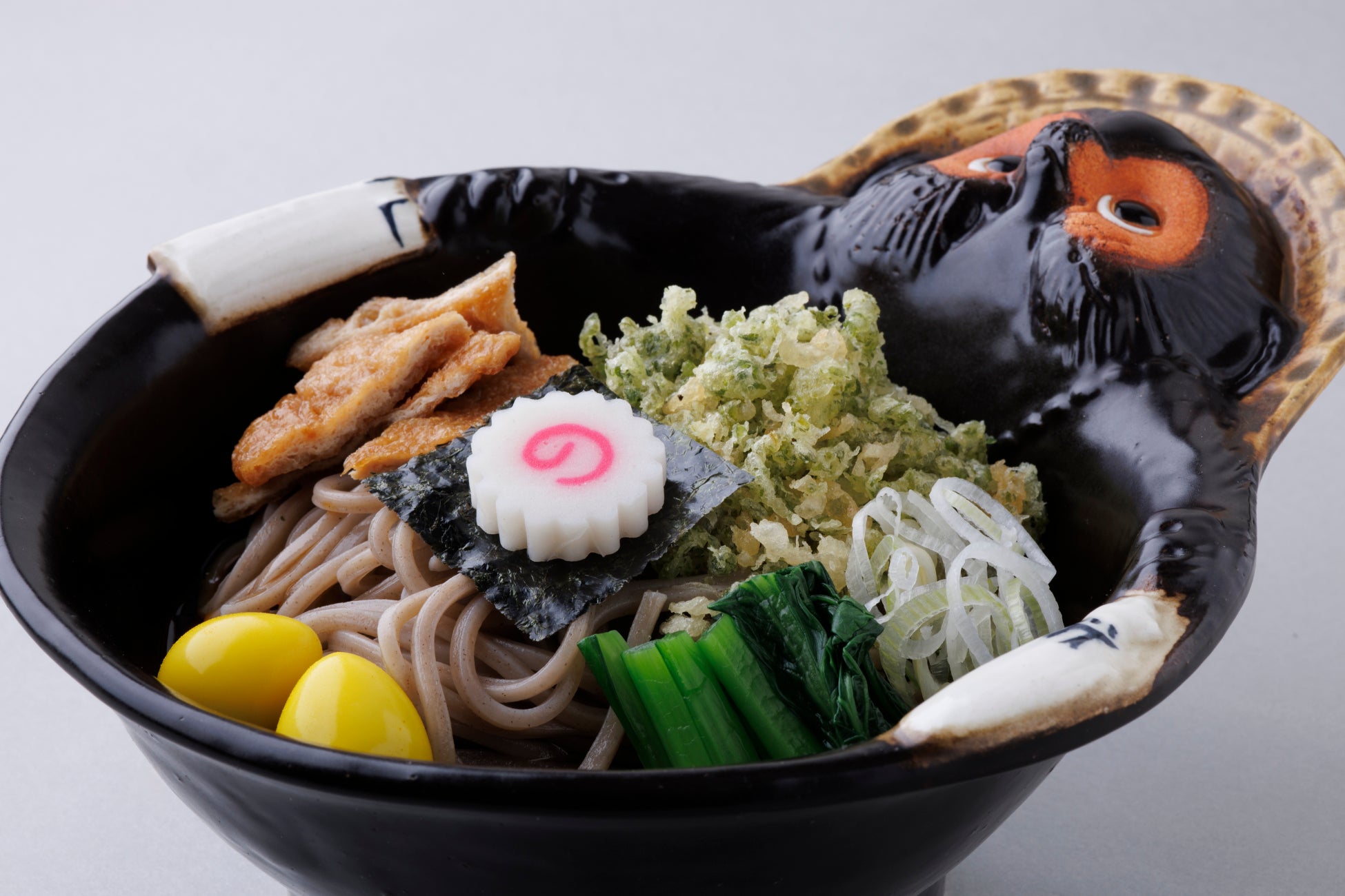 たぬきは飲み物。のたぬきそばは、本場・信楽の窯元で作られた特注のたぬきの器で提供します。
