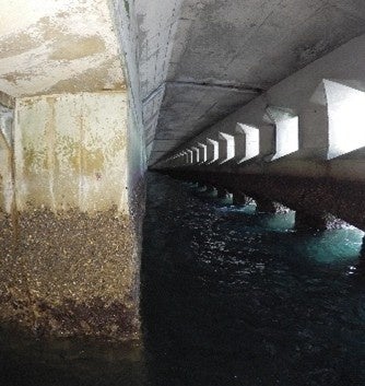 この管渠は潮位の影響を大きく受けるため、潮位の低い干潮のタイミングを狙って点検・調査を実施しようとしていました。しかし、干潮のタイミングでも水位が高く、また放流先が海に直結していることから、従来の人による点検や潜行調査、機械(浮流式カメラ)を使用した調査が困難な状況でした。そこで、安全に実施可能な点検・調査方法を検討していたところ、ドローンを使用する方法を知りました。