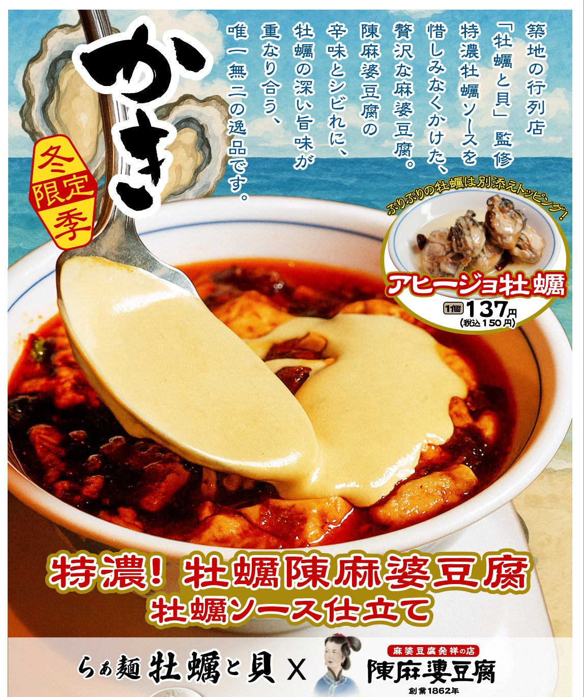 この度『陳麻婆豆腐』では、お客様に「食」で元気になっていただきたい、本場四川省の味をさまざまなスタイルで楽しんでいただきたいとの想いから、『らぁ麺 牡蠣と貝』が監修した濃厚な牡蠣ソースをたっぷり使った陳麻婆豆腐「特濃!牡蠣陳麻婆豆腐 牡蠣ソース仕立て」を期間限定メニューとして提供いたします。