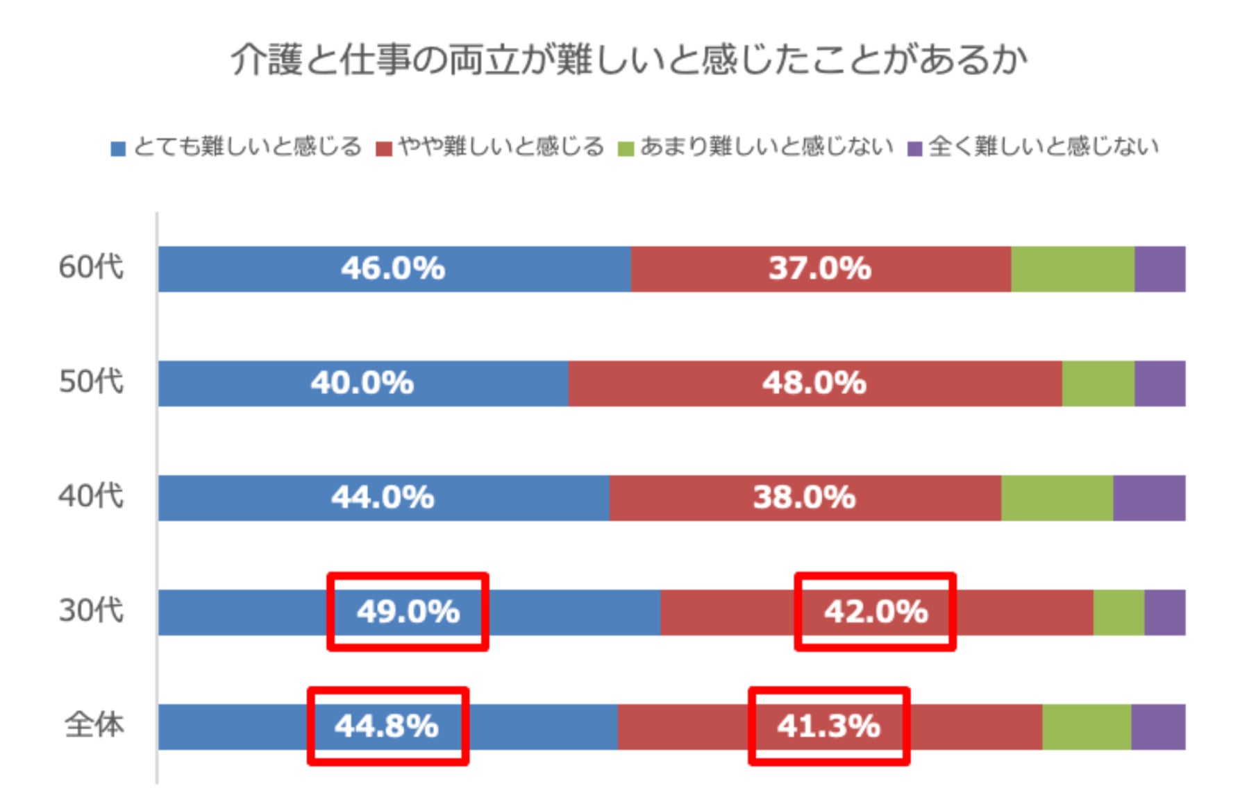 仕事と介護の両立が難しいと感じる人は全体の85% 。特に30代は90%を超える
