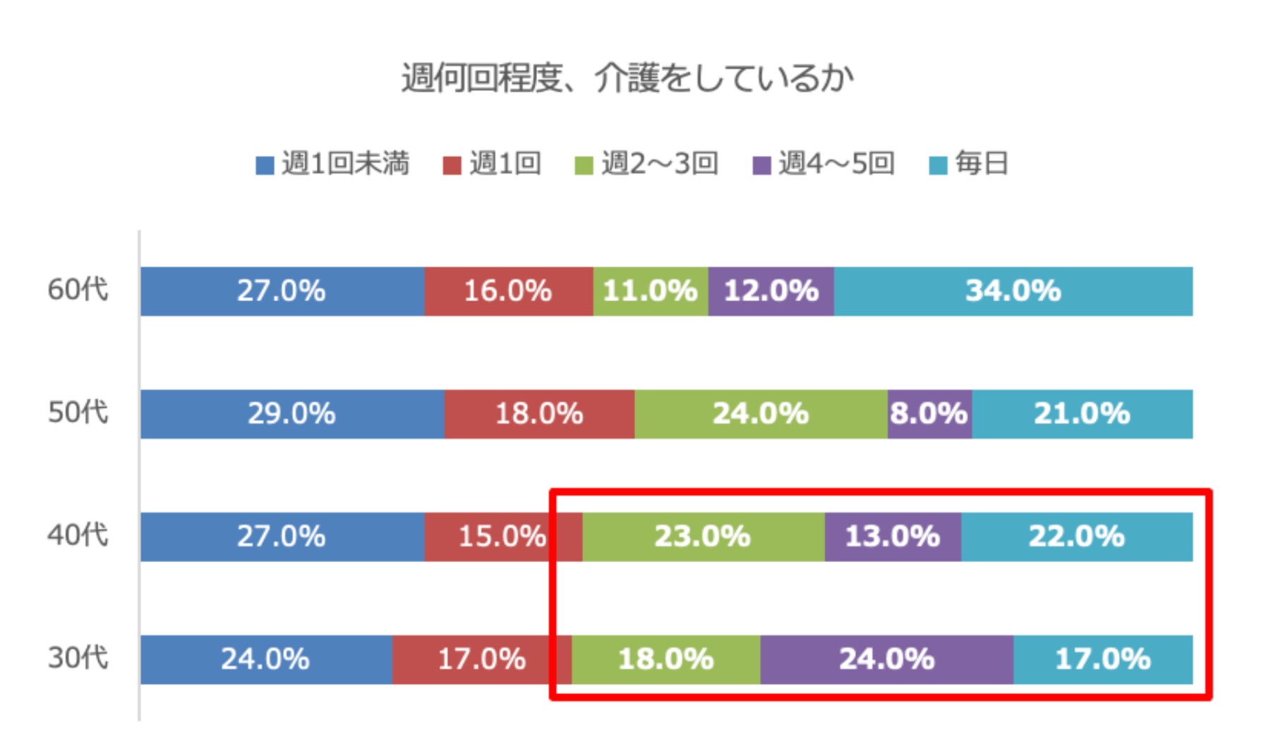 仕事と介護を両立する30代〜40代のうち、約6割が週2日〜3日以上、介護をしている