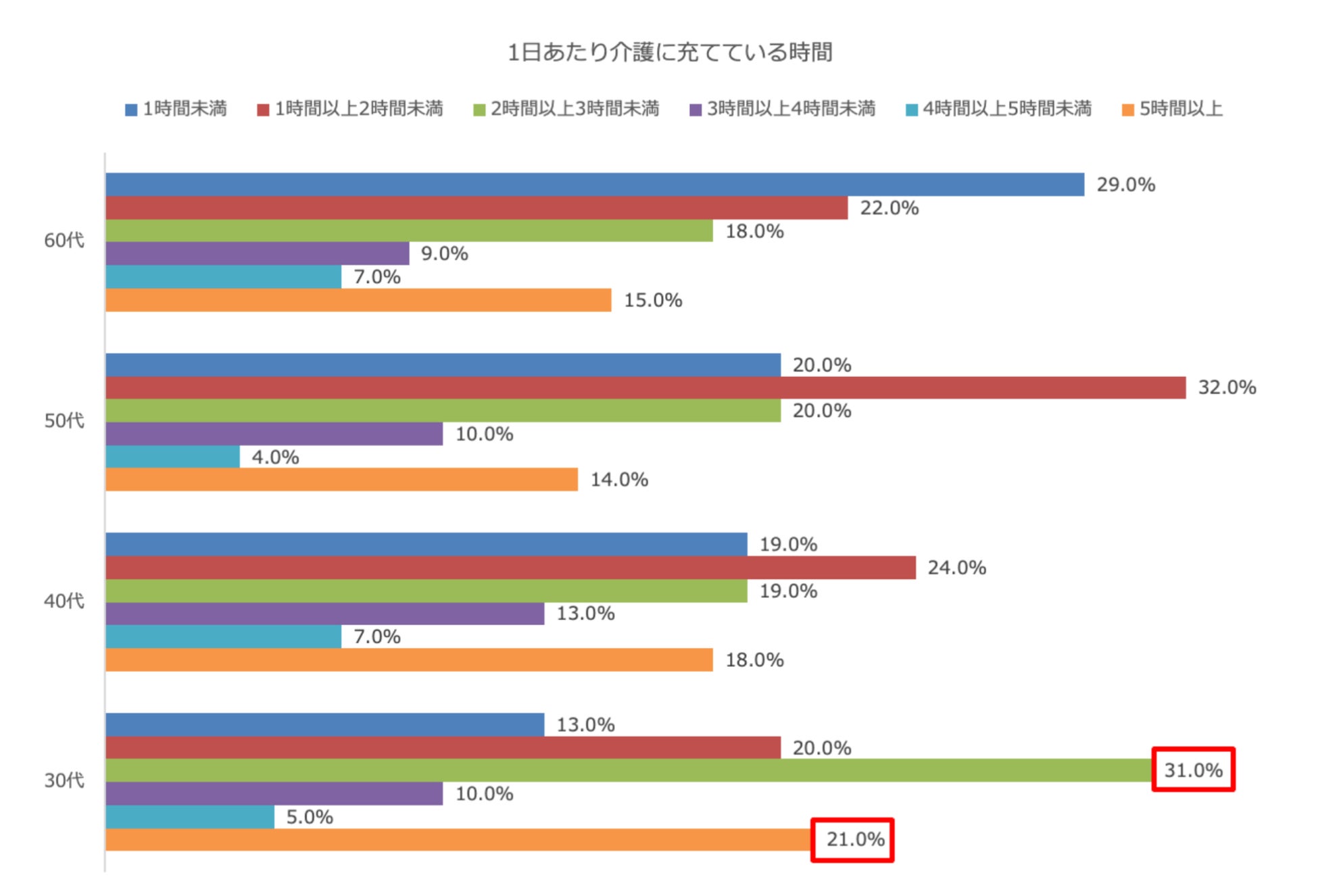 1日あたり介護に充てる時間では、30代の負担の重さが明らかに