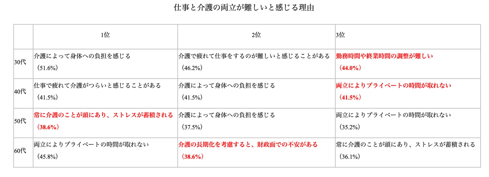 難しさを感じることとして「仕事と介護の両立による身体的な負担」が共通する一方、30代は「仕事の調整の難しさ」、40代は「プライベートの時間が取れない」、50代は「介護によるストレス蓄積」、60代は「介護の長期化による財政面の不安」と、世代毎に難しさを感じるポイントが異なる