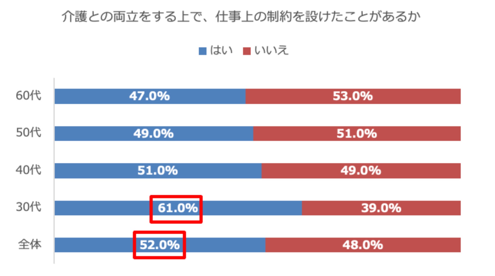 ・介護と仕事の両立をする上で、仕事上の制約を設けたことがあるかを聞いたところ、全体で「はい(52.0%)」となり、特に30代は61%という結果に