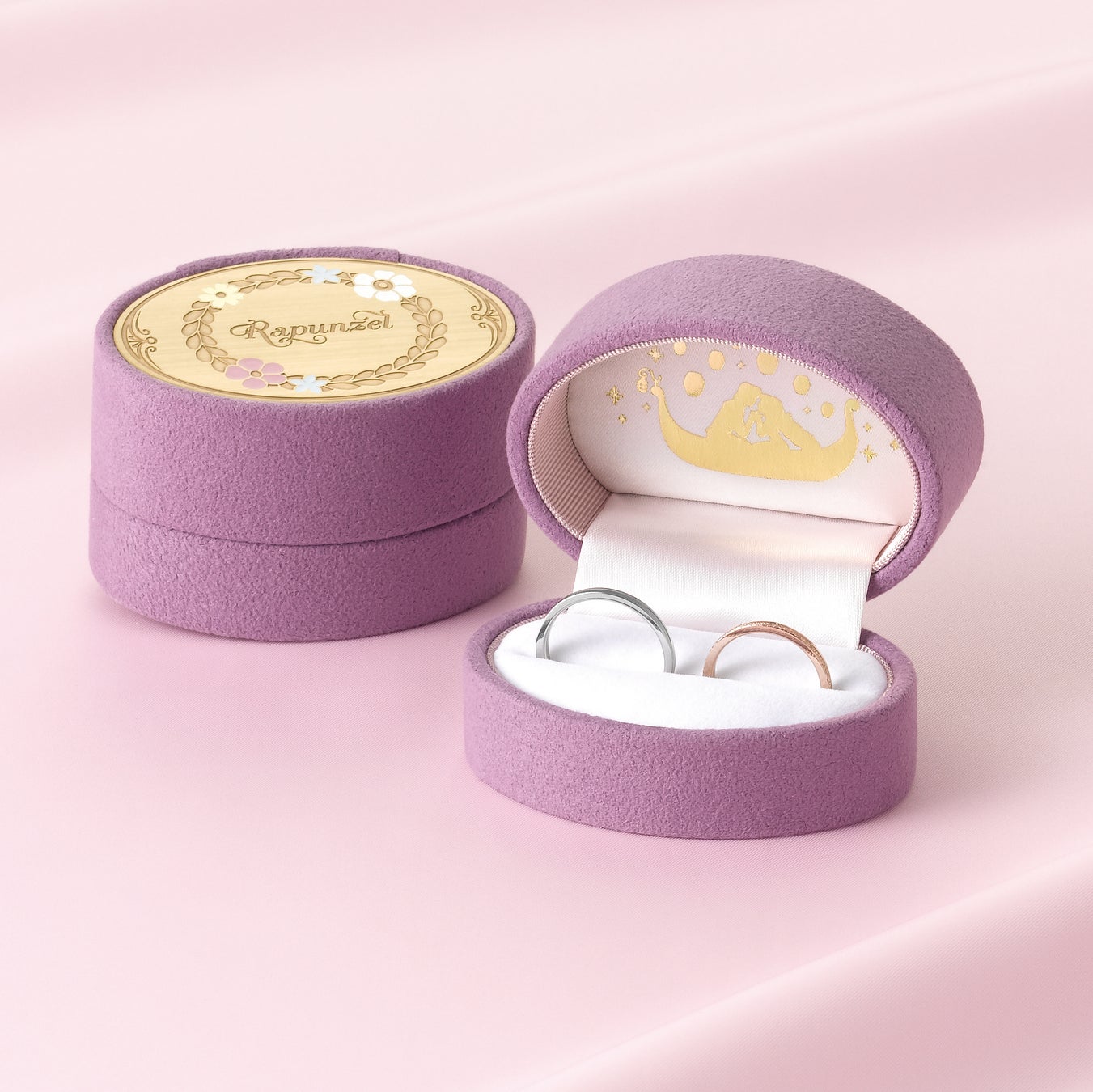 髪を結ってもらい小花を飾り付けたラプンツェルの髪形を連想させる、小花を散りばめたような可愛らしいデザイン。センターダイヤモンドを囲む花びらの装飾でダイヤモンドがより大きく見えます。イメージカラーであるパープルのアメジストをセッティングした特別なエンゲージリングです。