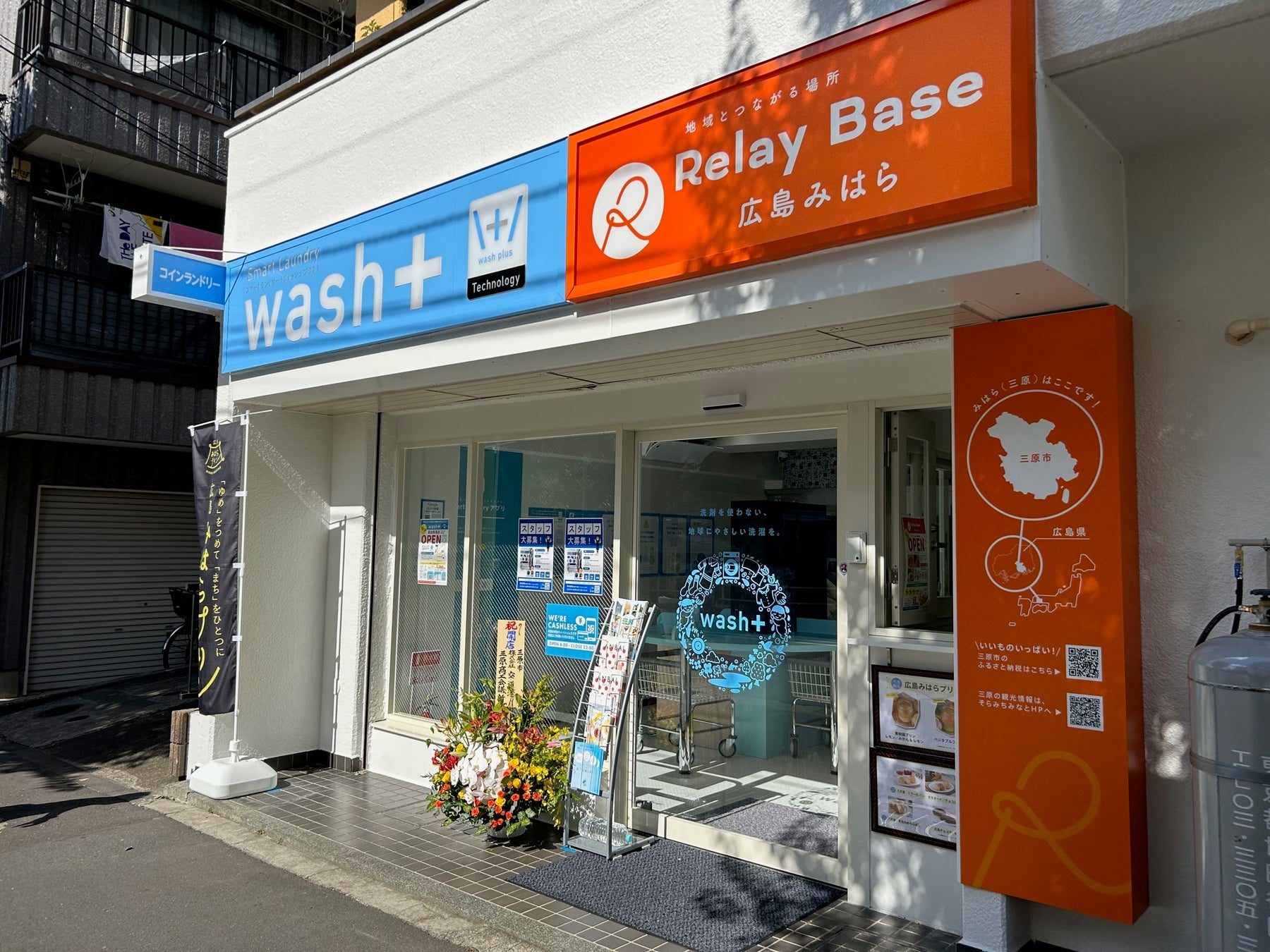 第1号店「リレーベース 広島みはら 高田馬場店」は、同日オープンした「コインランドリーwash+ 高田馬場店」内に併設された、店舗併設型のショップです。
