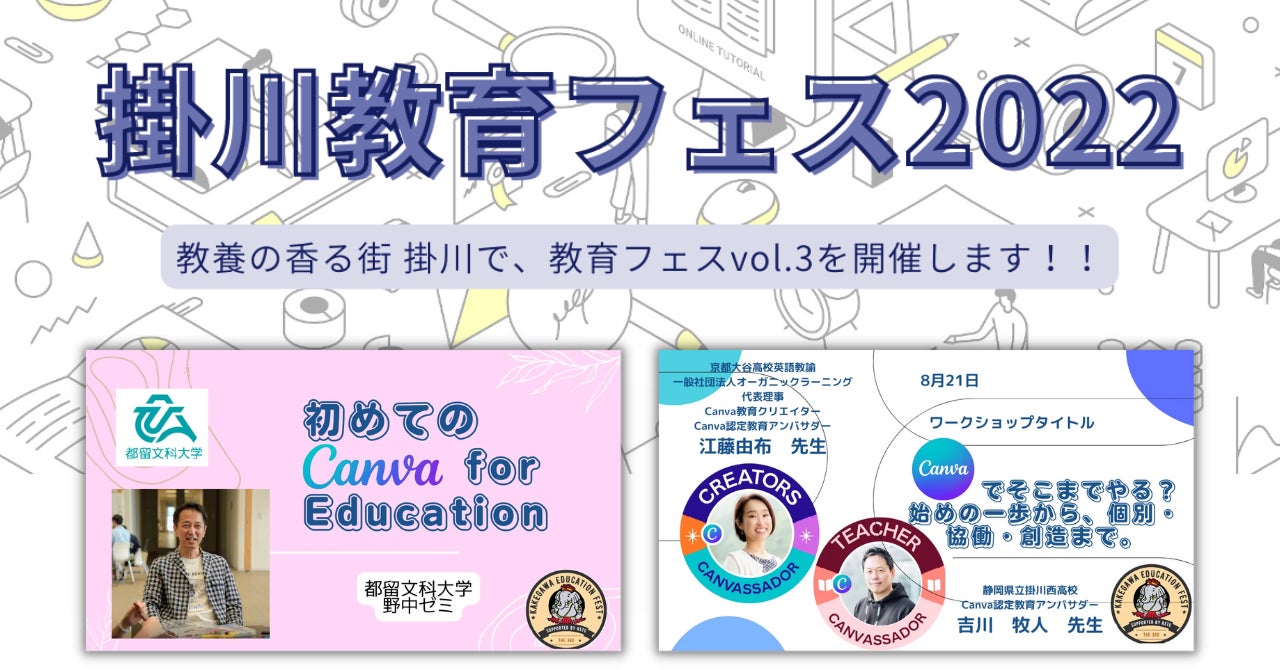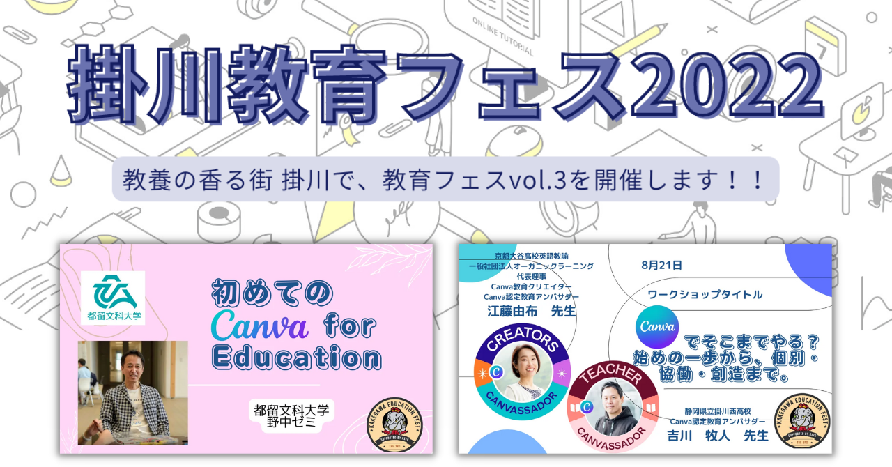 教養の香る街、静岡県掛川市で、今年3年目となる「掛川教育フェス2022」が開催されます。2日間に渡って行われるプログラムの中で、Canva初心者を対象とした都留文科大学野中ゼミの学生によるデザインワークショップや、「個別・協働・創造」まで、無限に広がるCanvaの使い方を学べるワークショップなど、2学期を目前にしたこの時期に嬉しい内容です。夜の部で先生方が焚き火を囲んで繰り広げる教育トークも必見です。ほとんどのプログラムがオンラインでも配信されるため、全国から気軽に参加できます。