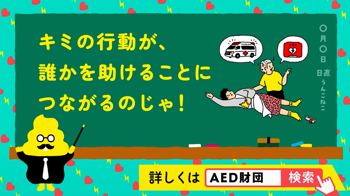 クスッと笑ってしまう「うんこ」が登場するシュールなイラストと、うんこドリルでおなじみの人気キャラクター・うんこ先生の登場で、AEDを身近に感じることができます。
