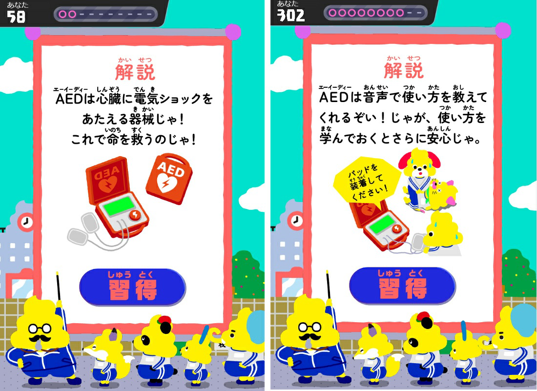 解答が終わったら、うんこ先⽣によるポイント解説が。クイズ形式で楽しみながらAEDの正しい使い⽅や注意点について繰り返し学ぶことができます。