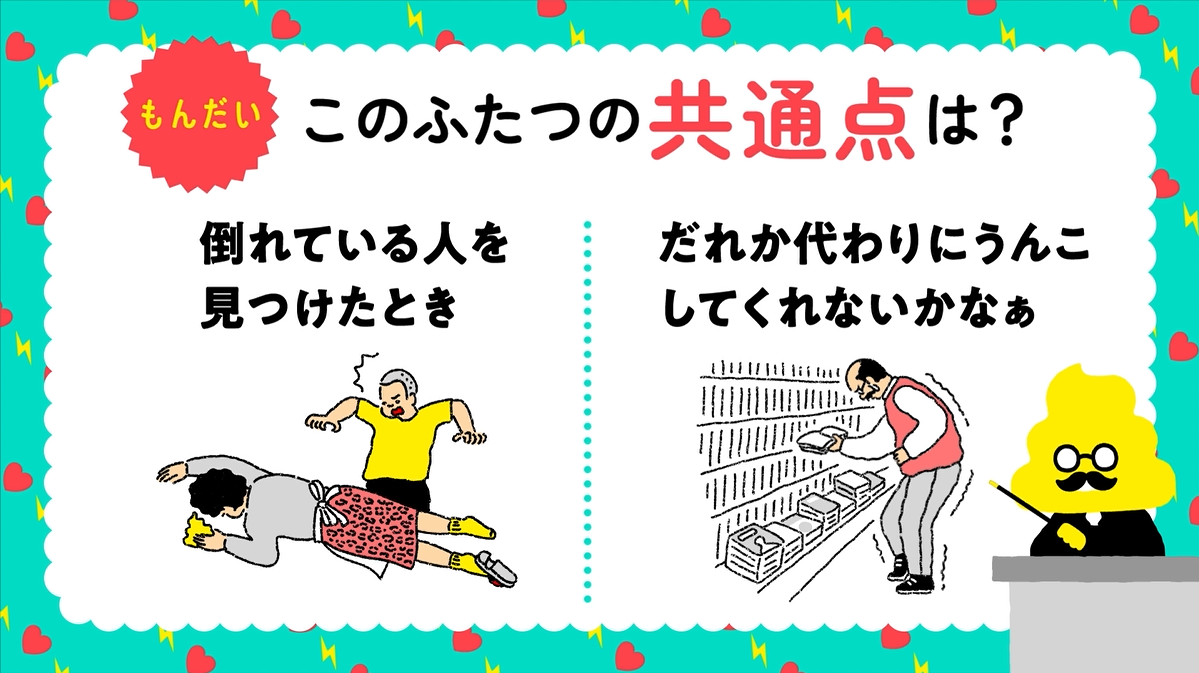 いずれの動画も一問一答のクイズ形式で、イラストの共通点を考えます。「うんこ」のちからを借りて、多くの人に心肺蘇生やAEDに関心を持ってもらえるような内容になっています。