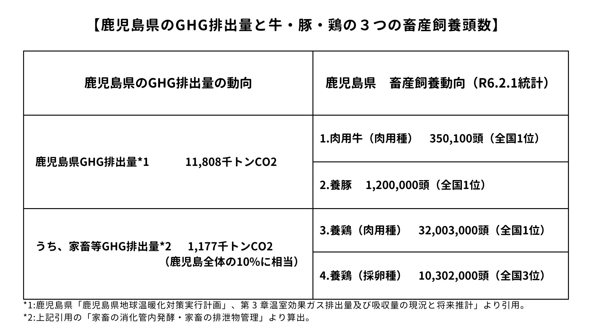 プロジェクトを開始する鹿児島県は、国内トップの牛、豚、鶏の3つの飼養頭羽数を誇る、畜産王国です。畜産業が盛んである一方で、牛のゲップや家畜の排泄物から温室効果ガス(GHG)の種類であるメタン(CH4)や亜酸化窒素(N2O)が排出され、1,777千トンCO2相当を排出しています(下表参照)。