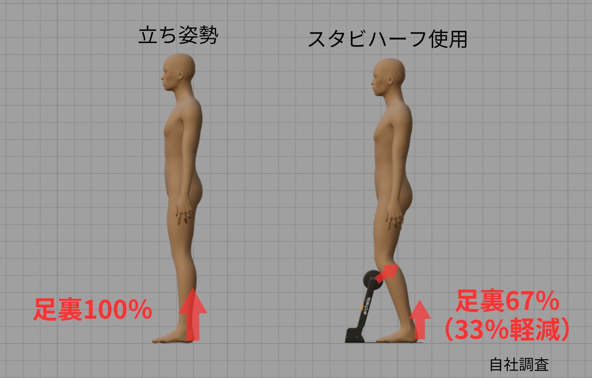 立ち姿勢では体重負荷が100%足裏に集中して、足や腰に疲労が溜まります。「スタビハーフ」は体重を分散して支えることで足裏への負荷を最大33%軽減することができます。