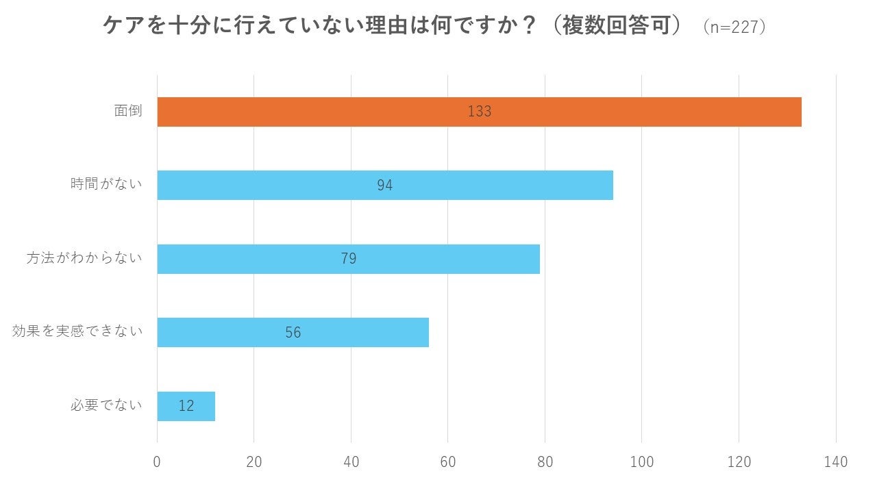「ケアを十分に行えない理由は何ですか?(複数選択可)」(n=227)という質問では、「面倒に感じる」が最も多く133件にのぼり、次いで「時間がない」(94件)、「方法がわからない」(79件)、「効果を実感できない」(56件)という結果となりました。