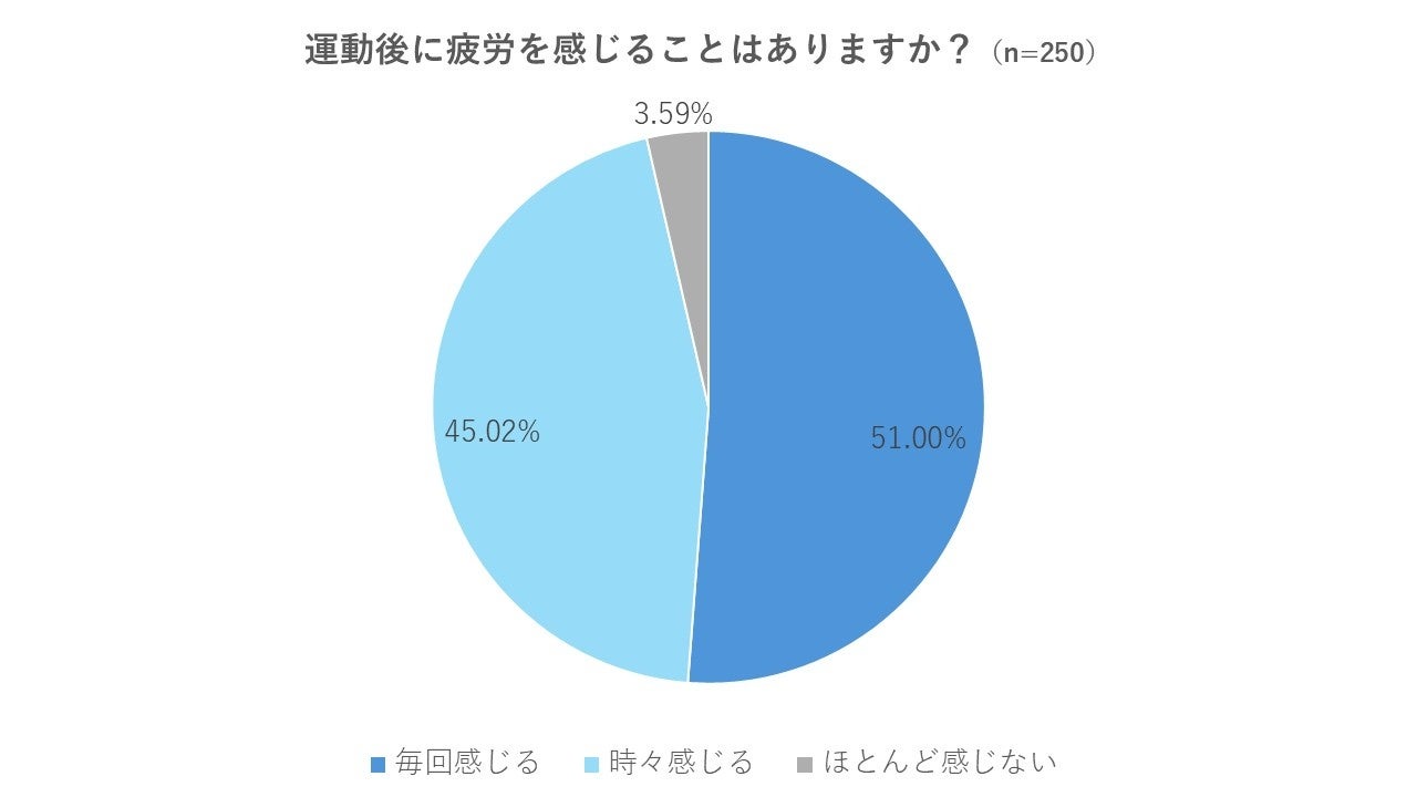 「運動後に疲労を感じることはありますか?」(n=250)という質問に対し、「毎回感じる」と答えた人は51.00%、「時々感じる」は45.02%でした。一方、「ほとんど感じない」と答えた人は3.59%にとどまりました。