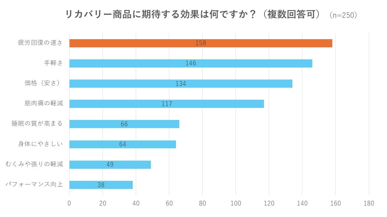 「リカバリー商品に最も期待する効果は何ですか?(複数選択可)」(n=250)の結果は、以下の通りでした。