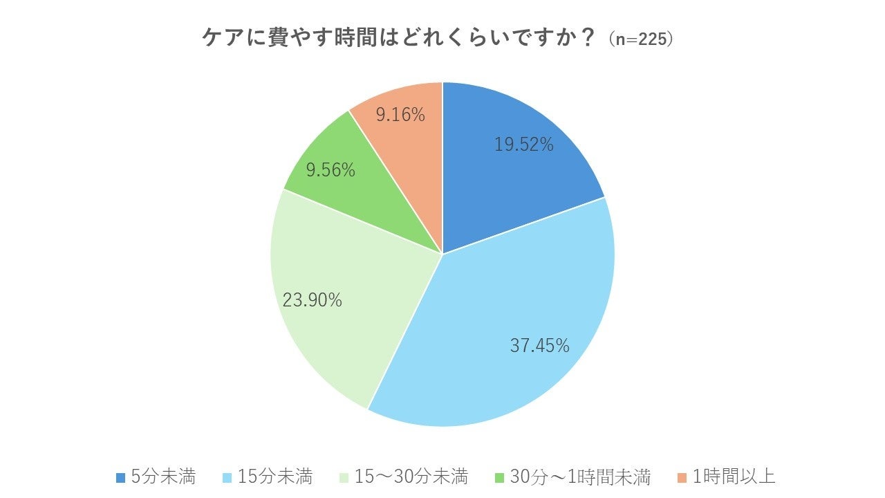 「ケアに費やす時間はどれくらいですか?」(n=225)の質問に対し、最も多かったのは「15分未満」で37.45%、次いで「15分~30分」が23.90%、「5分未満」が19.52%となりました。