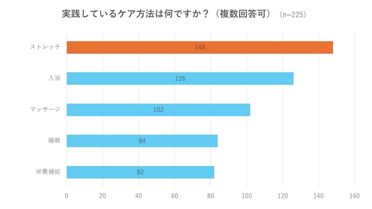 「現在実践している回復(リカバリー)方法は何ですか?(複数選択可)」(n=225)と質問したところ、最も多かったのはストレッチ、入浴、マッサージでした。