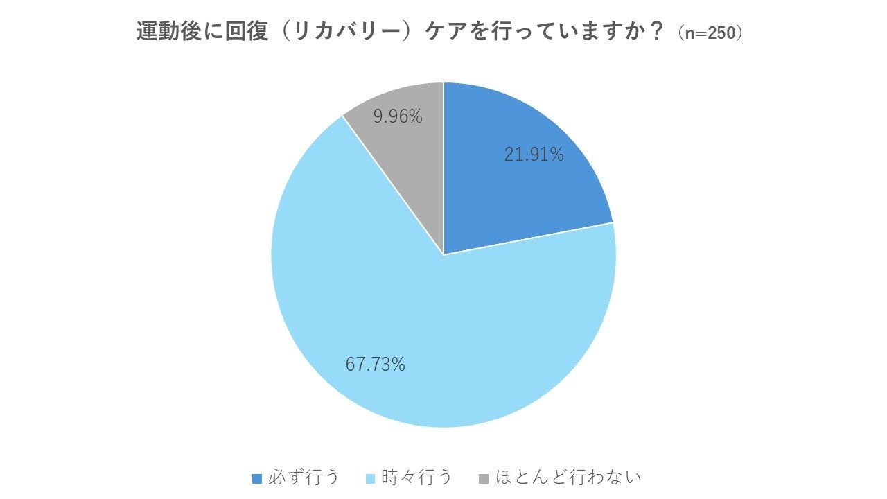 「運動後に回復(リカバリー)ケアを行っていますか?」(n=250)という質問に対し、「必ず行う」と答えた人は21.91%、「時々行う」は67.73%でした。一方で、「ほとんど行わない」と答えた人は9.96%にとどまりました。