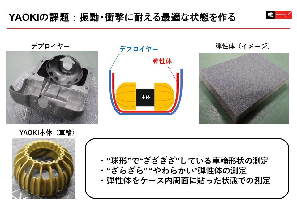 また、YAOKIは、月着陸船で月までデプロイヤーごと運ばれ、着陸後にデプロイヤーから飛び出して月面探査を行います。YAOKIが輸送時の振動に耐えられるよう、デプロイヤーとYAOKI本体の隙間(クリアランス)はスポンジ状の弾性体で適切に詰める必要があります。当社では、その数値をデータ化し検証することで、最適なデプロイヤーの寸法や弾性体の厚さなどを導き出すためのサポートを行いました。