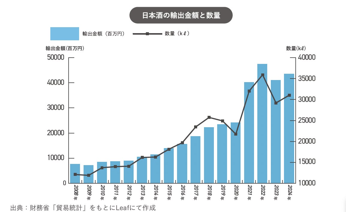 日本酒の海外輸出量は近年、継続的に増加。海外の和食店の急増に伴い、グローバル市場はさらに拡大すると見込まれています。さらに、2024年12月には、⽇本酒を含む「伝統的酒造り」がユネスコ無形⽂化遺産に登録され、日本酒の注目度はますます高まると期待されています。