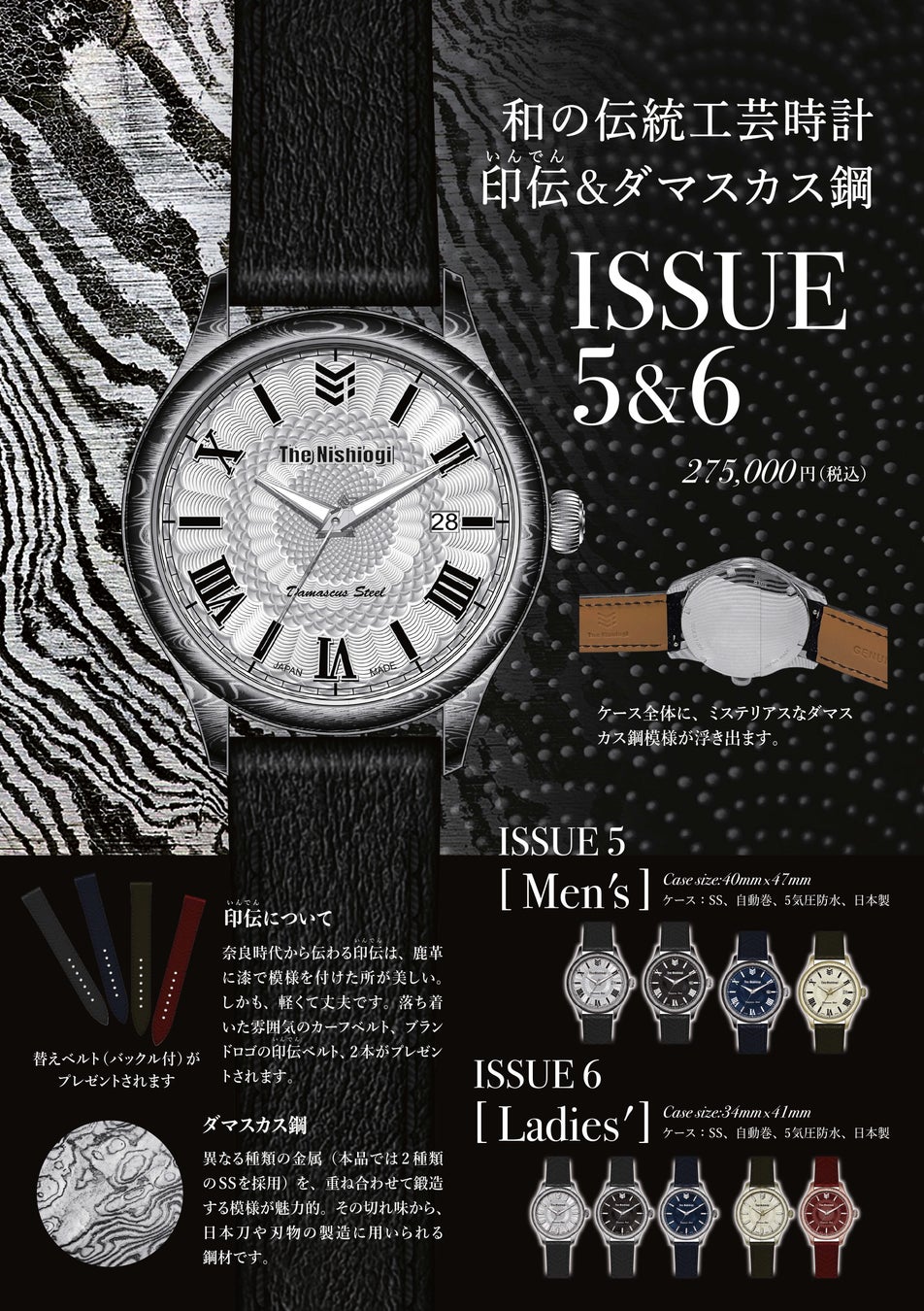 2022年に彗星のごとく発表された、新たな日本製ウォッチブランド「The Nishiogi」は、従来品とは一線を画すユニークなデザインや素材、技法の採用と、高品質低価格なジャパンクォリティで、瞬く間に人気を博しています。この度、新たにコレクションに加わった「ISSUE5&6」は、ダマスカス鋼と、印伝(いんでん)という和の伝統素材を用い、まるで伝統工芸品のような存在感を放ちます。