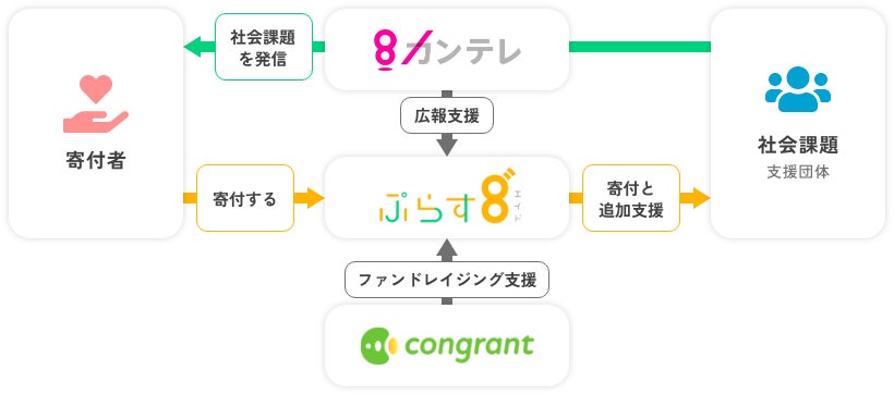 「ぷらす8゛」は関西テレビ放送株式会社とコングラント株式会社の連携プロジェクトです。参加する団体はコングラントが提供するシステムを活用してクラウドファンディングページを立ち上げ、寄付の募集を開始します。(システムの導入費用は関西テレビが負担)